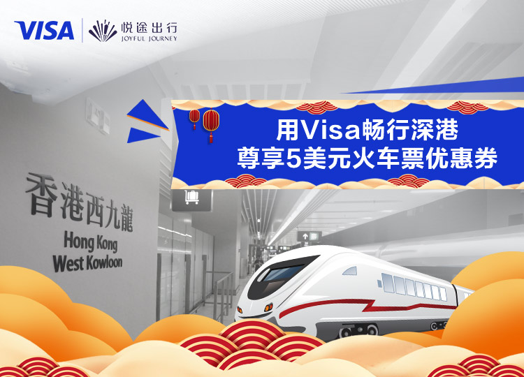 用Visa畅行深港,尊享5美金火车票优惠券Travel seamlessly between Shenzhen and Hong Kong with Visa and enjoy an exclusive US$5 train voucher.